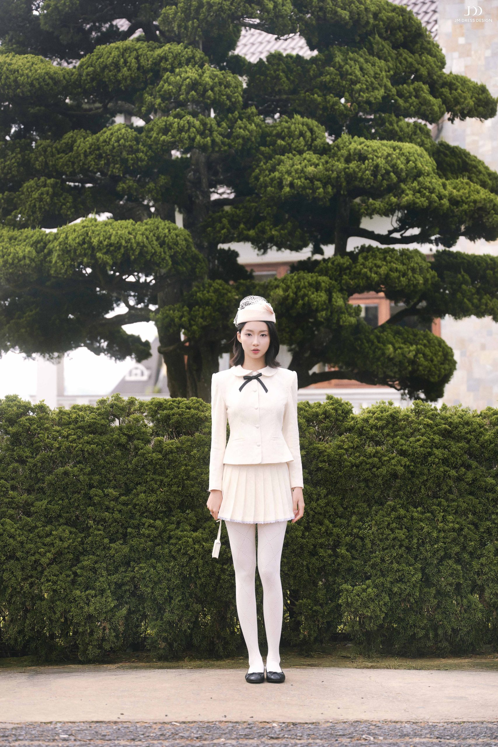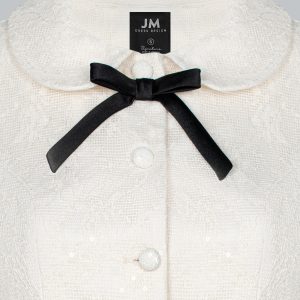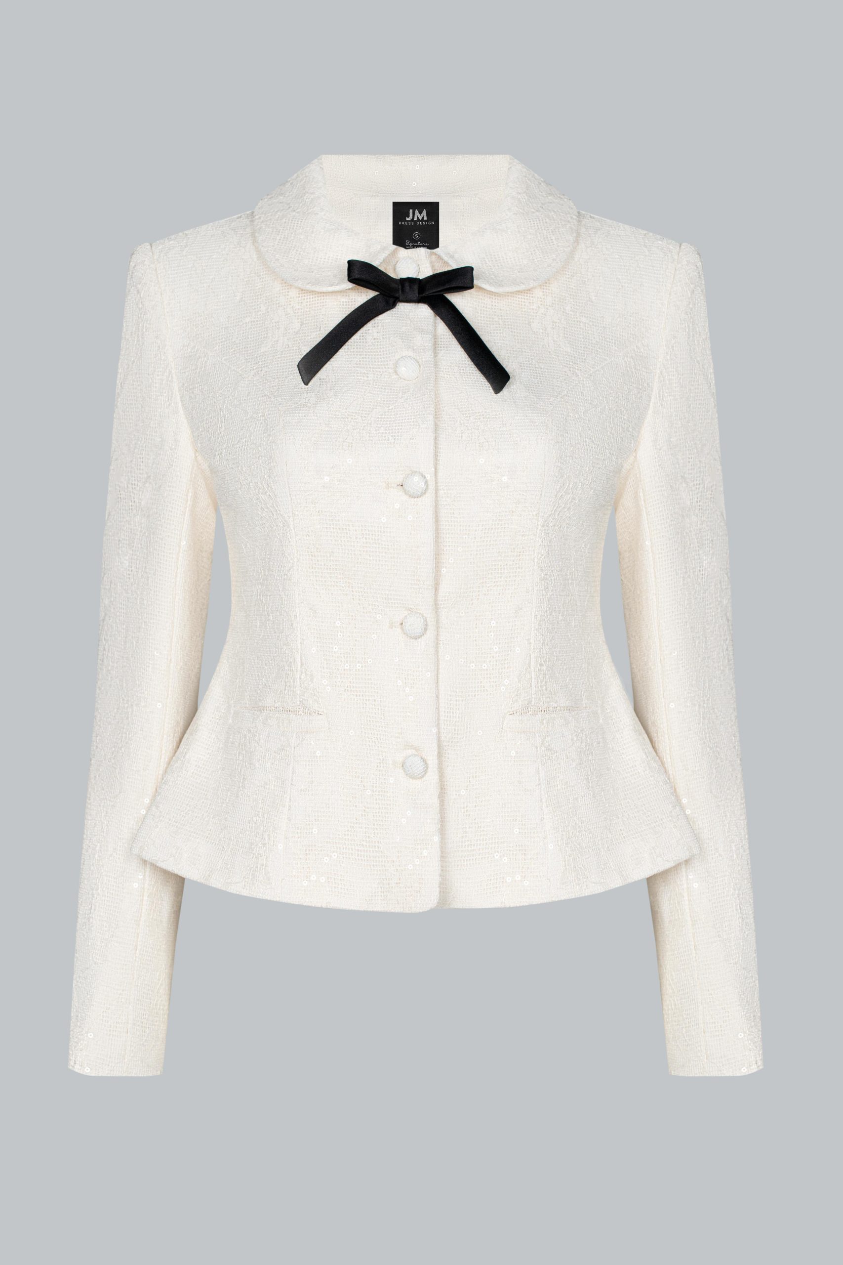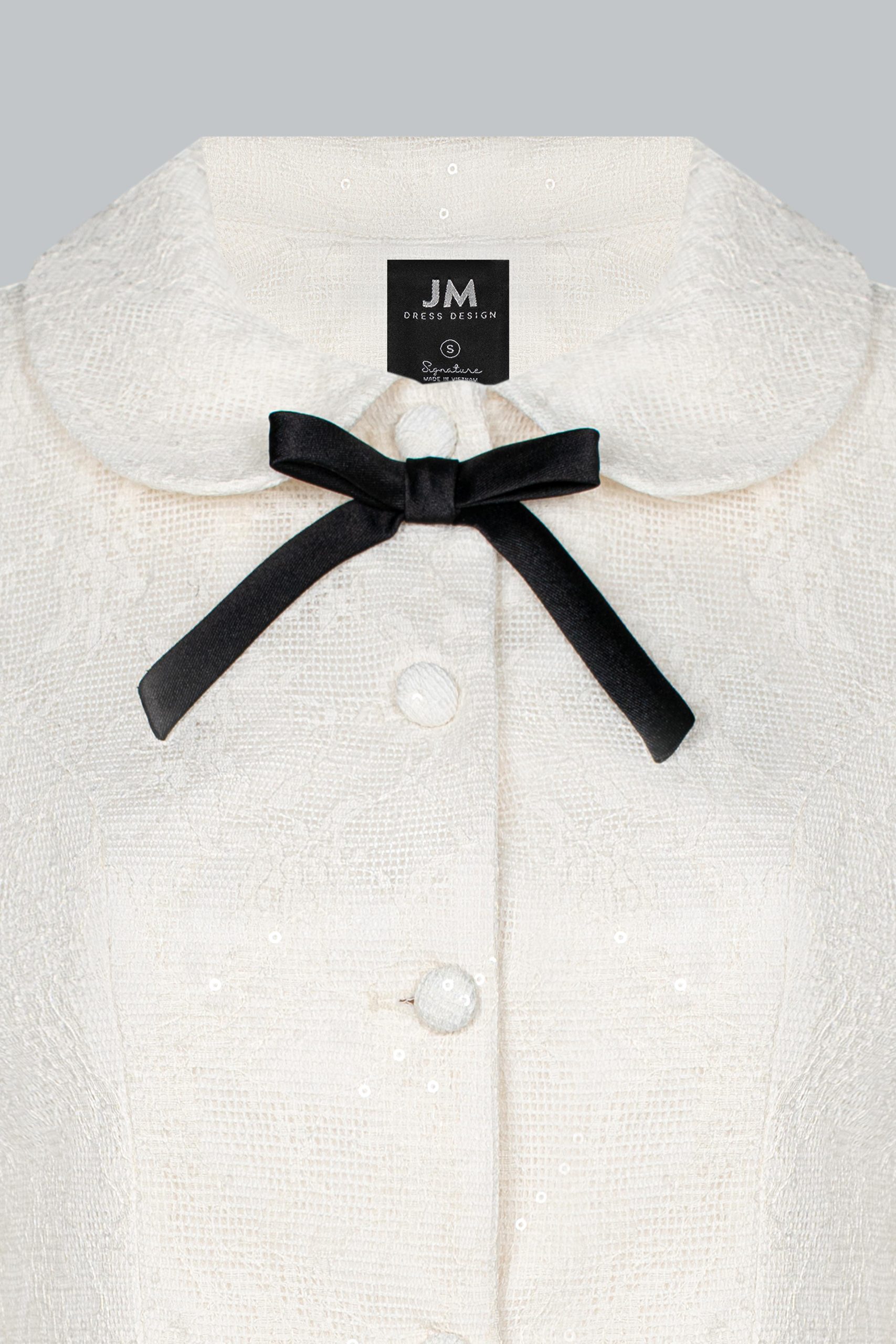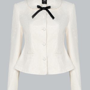 Áo blazer dáng ngắn, ôm nhẹ ở eo để tôn dáng nhưng vẫn giữ sự thanh lịch. Cổ Peter Pan mềm mại, mang không khí cổ điển. Hàng khuy tròn đồng màu tạo sự tinh tế, tối giản. Nổi bật nhất là chi tiết nơ đen nhỏ ở cổ – điểm nhấn nữ tính.