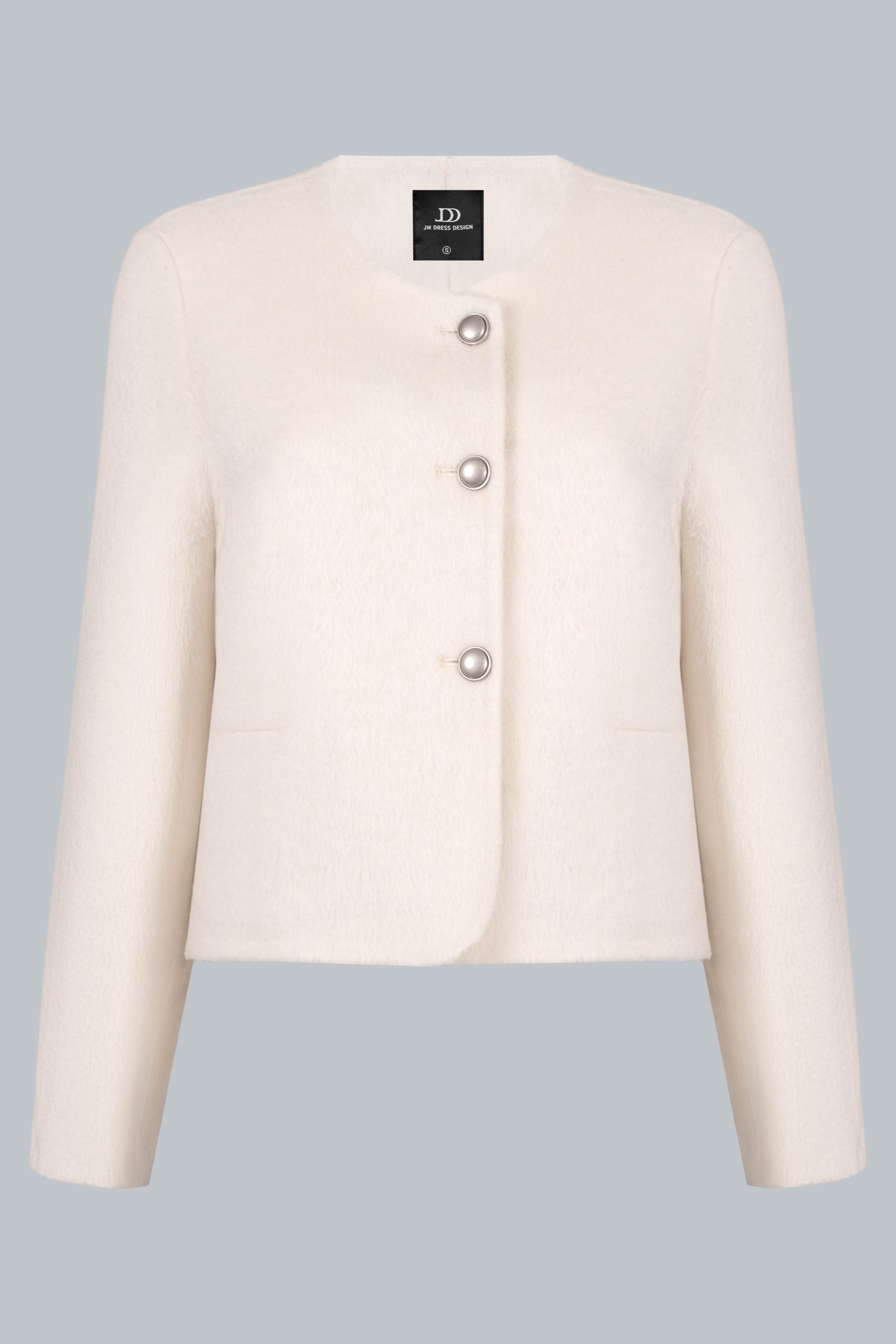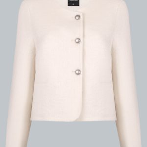 Áo khoác dạ dáng ngắn, phom suông gọn, độ dài ngang hông giúp tổng thể trông cân đối và dễ phối cùng nhiều dáng trang phục.