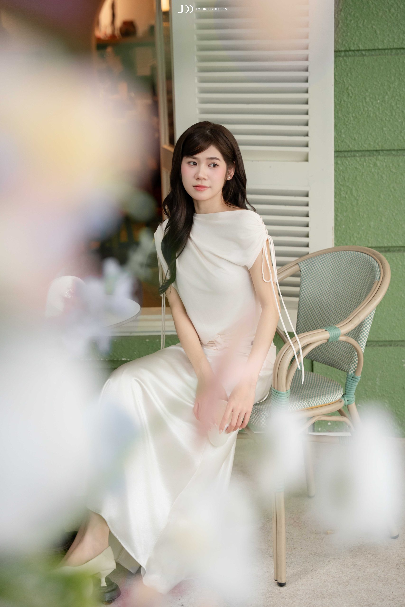 Thiết kế sử dụng chất liệu có độ rủ tự nhiên, bề mặt mịn và bắt sáng dịu. Vải giúp giữ phom A-line rõ nét mà vẫn tạo được chuyển động mềm mại. Đòng thời hạn chế nhăn và phù hợp cho các dịp kéo dài.