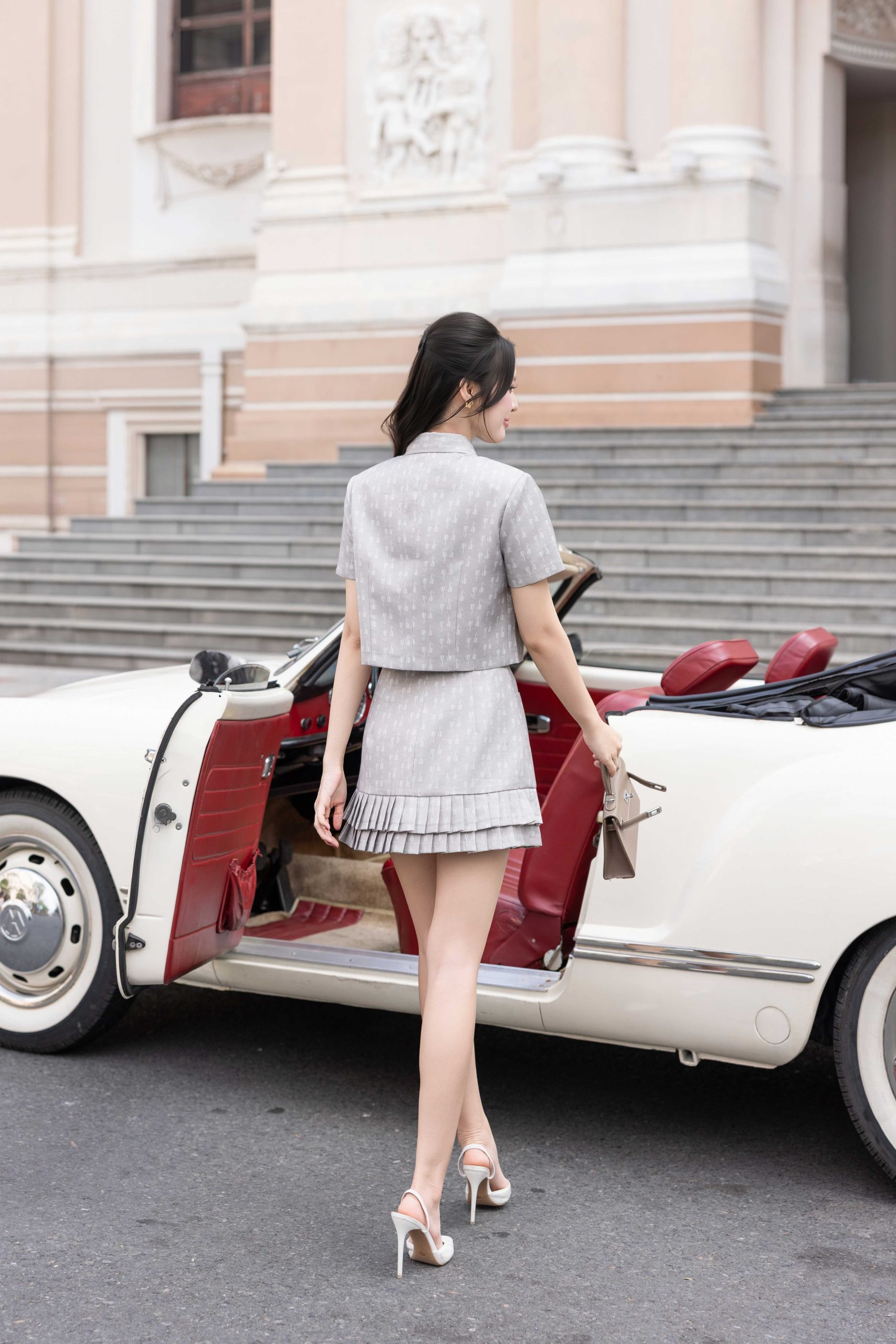 Chân váy dáng ngắn với phom gọn gàng, giúp tôn lên đường nét thanh thoát của đôi chân và tạo cảm giác cân đối cho tổng thể trang phục. Các đường cắt được xử lý tinh giản nhưng chuẩn xác, mang đến vẻ ngoài chỉn chu và hiện đại.